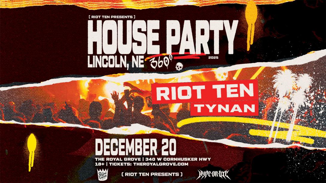 The Royal Grove presents: Riot Ten: House Party 360 Tour - December 20th, 2025Support: TYNANGet ready, Lincoln! Riot Ten is bringing his House Party 360 Tour to The Royal Grove with support from TYNAN. Known for his explosive blend of dubstep, trap, and electro, Riot Ten has become one of the most electrifying names in bass music, with massive hits like “Rail Breaker” and “Fck It”* shaking crowds around the world.This isn’t just any set. It’s a 360° experience, putting you right in the middle of the action as the energy surrounds you from every side. From global festival stages to sold-out tours, Riot Ten’s high-octane sound and relentless drops have made him a fan favorite everywhere he goes.Tickets on sale at theroyalgrove.com